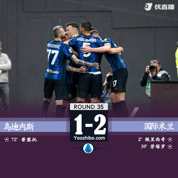 直播车 5月2日讯 北京时间5月2日凌晨0点整,2021-22赛季意甲第35轮在弗里乌利体育场展开角逐,国际米兰客场挑战乌迪内斯。上半场佩里西奇先拔头筹,哲科造点,劳塔罗扩大比分,下半场哲科失单刀,普塞托扳回一城,巴雷拉伤退。最终国际米兰客场2-1战胜乌迪内斯,积分榜方面,国米积75分,距离AC米兰2分位居第2名。