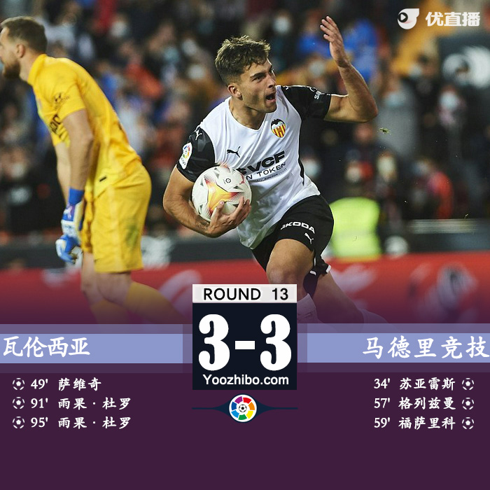 直播车讯11月8日讯 北京时间11月7日23点15分,西甲第13轮,马德里竞技客场挑战瓦伦西亚。上半场,特里皮尔伤退,苏亚雷斯破门。下半场,萨维奇不慎自摆乌龙,格列兹曼和福萨里科3分钟内连入两球,瓦斯射中门框,雨果杜罗替补登场在补时阶段连追两球完成绝平,全场比赛结束,马德里竞技3-3瓦伦西亚。