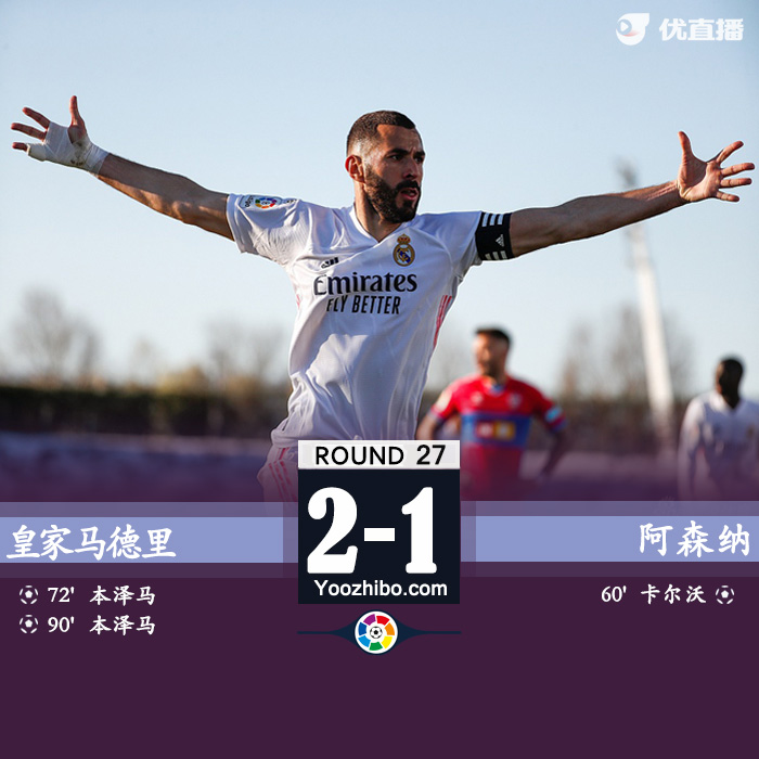 直播车3月14日讯 北京时间3月13日晚23点15分,2020-21赛季西甲第27轮在迪斯蒂法诺球场展开角逐,皇家马德里坐镇主场迎战埃尔切。上半场双方均无建树,下半场卡尔沃先拔头筹,本泽马头球扳平,阿扎尔复出替补登场,本泽马补时绝杀。最终皇家马德里主场2-1逆转埃尔切。积分榜方面,皇马落后榜首马竞5分,暂居第2名。