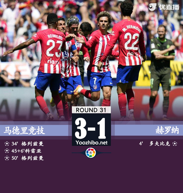 直播车讯:北京时间4月13日西甲联赛第31轮,马德里竞技主场迎战赫罗纳。格列兹曼为马德里竞技攻入两球,安赫尔-科雷亚也有一次得分。赫罗纳的多夫比克也有一次进球。最终比分是马竞3-1赫罗纳。