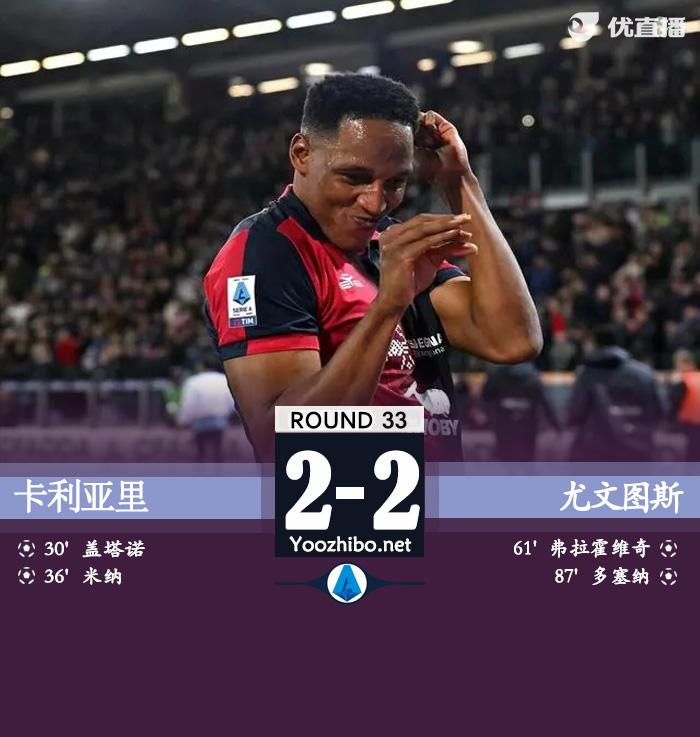 直播车讯:北京时间4月20日,意大利足球顶级联赛第33轮,卡利亚里队主场迎战尤文图斯队。上半场,布雷默、什琴斯尼连续送点,加埃塔诺、米纳点射破门,基耶萨越位在先,弗拉霍维奇进球被吹。下半场,弗拉霍维奇任意球破门,伊尔迪兹传中造成多塞纳自摆乌龙,最终,尤文客场2-2卡利亚里。