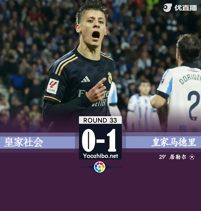 直播车讯:北京时间4月27日,西甲第33轮,皇马客场挑战皇家社会。上半场,卡瓦哈尔精妙助攻19岁居勒尔打进赛季第二球,久保健英进球被VAR取消。易边再战,奥亚萨瓦尔越位进球被吹。最终皇家社会0-1皇家马德里。积分榜方面,皇马27轮不败先赛14分领跑,皇家社会51分第六。