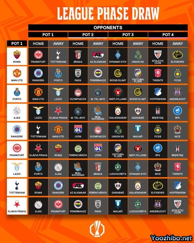第1档:罗马(意甲)、曼联(英超)、波尔图(葡超)、阿贾克斯(荷甲)、格拉斯哥流浪者(苏超)、法兰克福(德甲)、拉齐奥(意甲)、托特纳姆(英超)、布拉格斯拉维亚(捷甲)