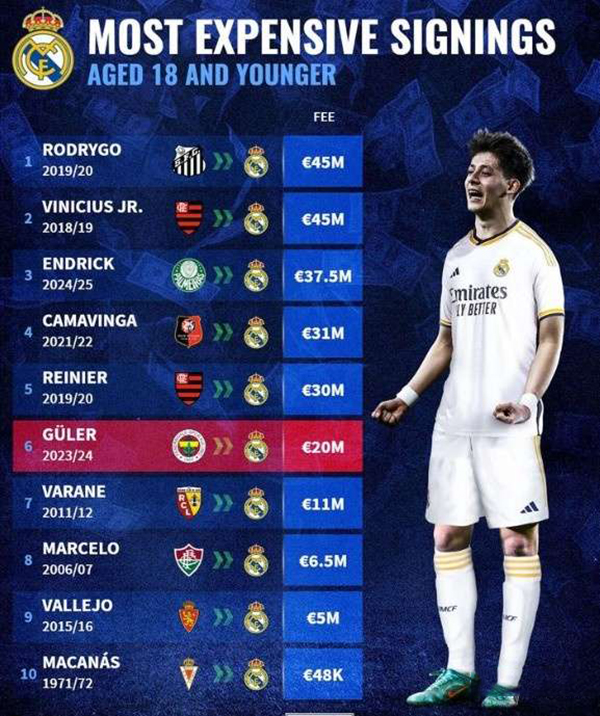 直播车讯07月07日,皇马官宣签下土耳其05年天才居莱尔。德国转会市场网盘点了皇马引进U18球员的转会费排行榜。
