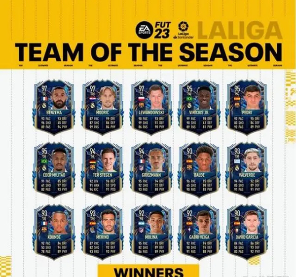 直播车讯05月25日,西甲联盟和EA SPORTS携手公布本赛季最佳阵容,共有15位球员入选。