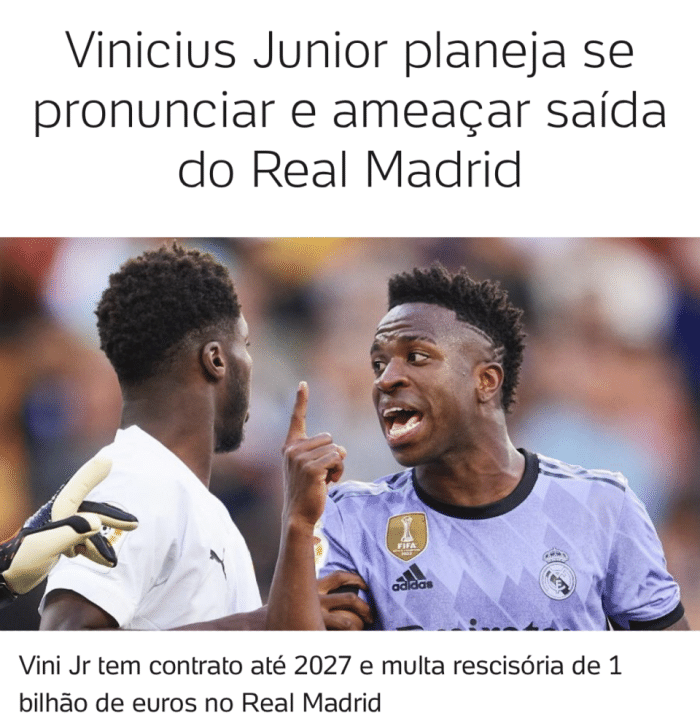 而来自巴西媒体媒UOL报道,在被瓦伦西亚球迷歧视并且被称为侮辱性的词汇后,对此深受伤害的巴西新星不会保持沉默,对目前西班牙足球环境十分失望他,计划继续接受采访发声,甚至威胁离开皇马结束这种情况,告别西甲去欧洲其他豪门踢球。