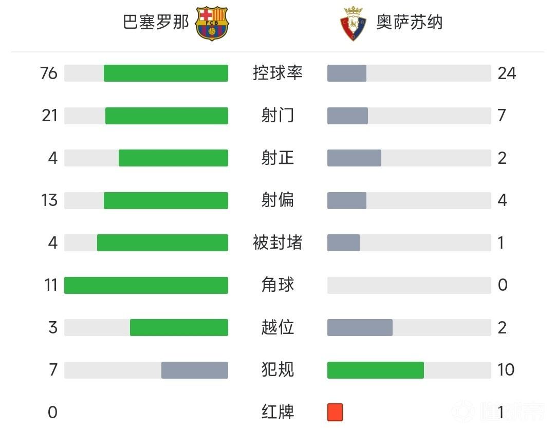 最终,巴萨1-0击败奥萨苏纳,先赛一场以14分的优势领跑。