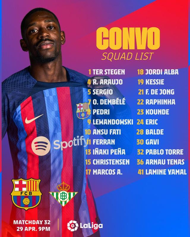 直播车讯 巴萨官方公布了西甲第32轮主场对阵贝蒂斯的比赛大名单,登贝莱、克里斯滕森伤愈回归,均获得队医出战许可,布斯克茨解禁复出,15岁小将亚马尔连续3场比赛入选。比赛将于北京时间4月30日3:00进行。