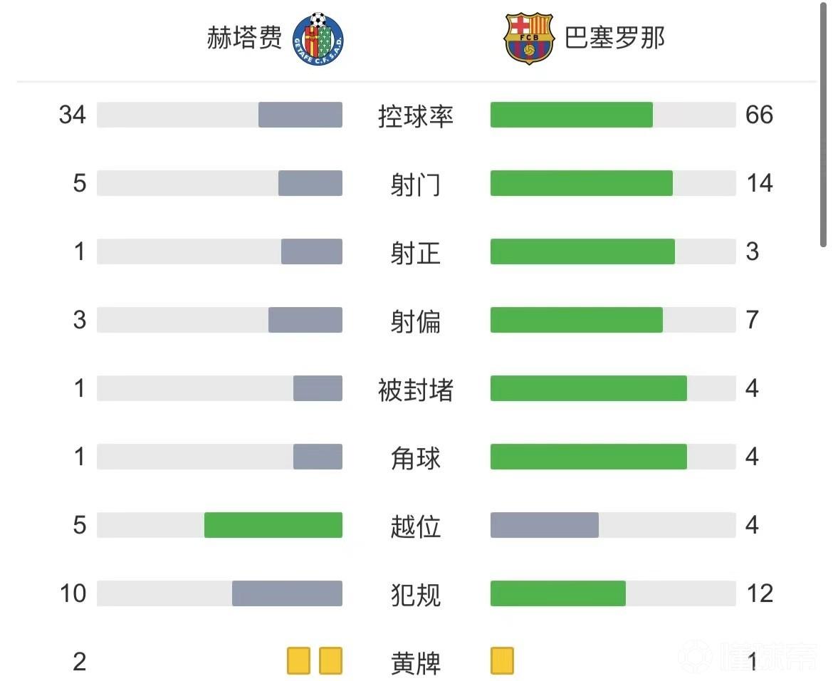 最终,巴萨客场0-0战平赫塔费,遭遇联赛2连平,以11分优势领跑积分榜。