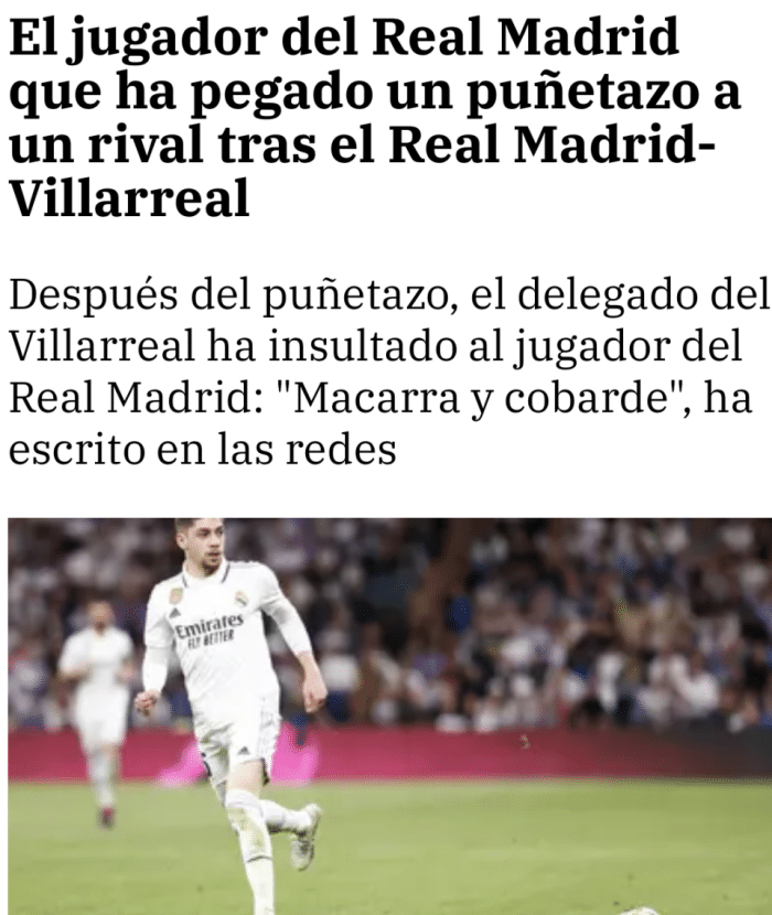 来源:直播车04-09 16:35直播车04月09日讯 ,来自西班牙六台的最新消息,在输给比利亚雷亚尔的赛后,皇马阵中的乌拉圭中场巴尔韦德,打了比利亚雷亚尔球员巴埃纳,记者Mario Cortegana也确认了这一消息。