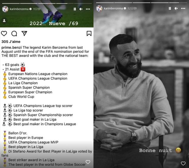 来源:直播车03-01 21:14直播车讯03月01日,皇马巨星本泽马在个人社交账号上晒出了一张照片,内容是FIFA年度最佳提名期间,他在俱乐部和国家队的进球助攻数据以及各类荣誉,以此来公开表达自己对于FIFA年度最佳球员评选结果的不满。
