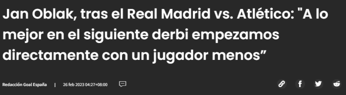 直播车讯02月26日,马竞在马德里德比中客场1-1战平皇马,赛后马竞门将奥布拉克抱怨己方前锋安赫尔-科雷亚被罚下。