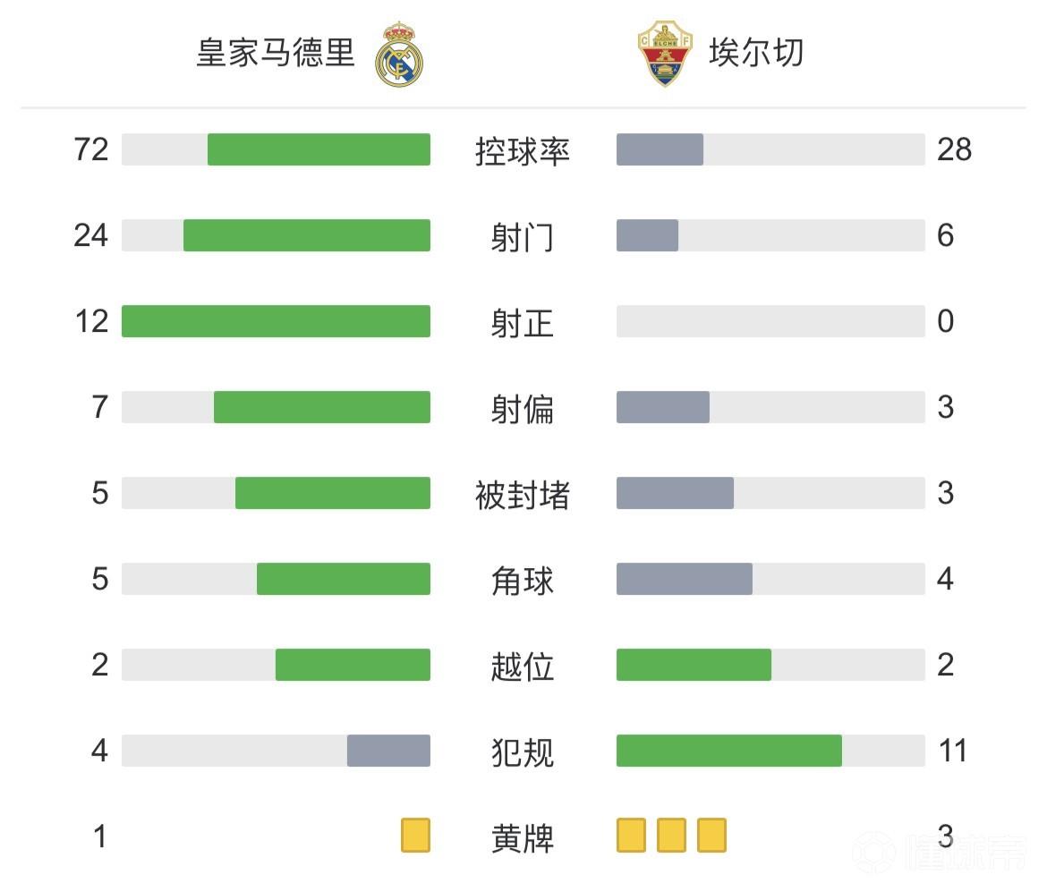 全场比赛结束,最终最终皇马4-0大胜埃尔切。皇马继续排名第二,距离领头羊巴萨还有8分差距。