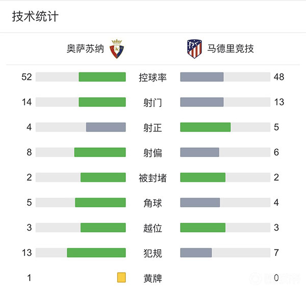 全场比赛结束,最终马竞客场1-0击败奥萨苏纳,取得联赛两连胜。