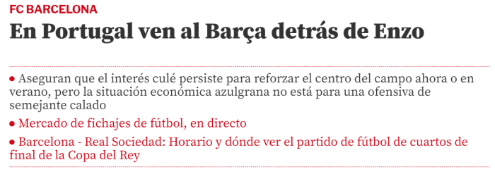 直播车01月25日讯 据西班牙媒体《世界体育报》援引葡萄牙媒体报道,巴萨也有意签下本菲卡的阿根廷新星恩佐-费尔南德斯,但无法给出高报价。