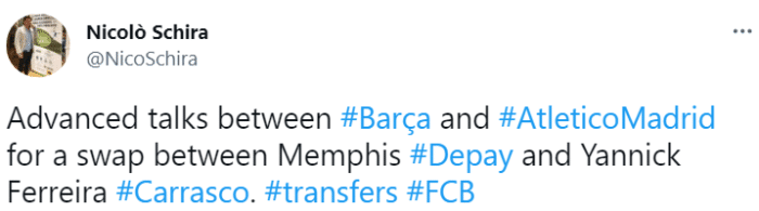 根据此前的报道,巴萨曾希望用德佩与国米交换阿根廷国脚华金-科雷亚,不过德佩本人希望加盟马竞。