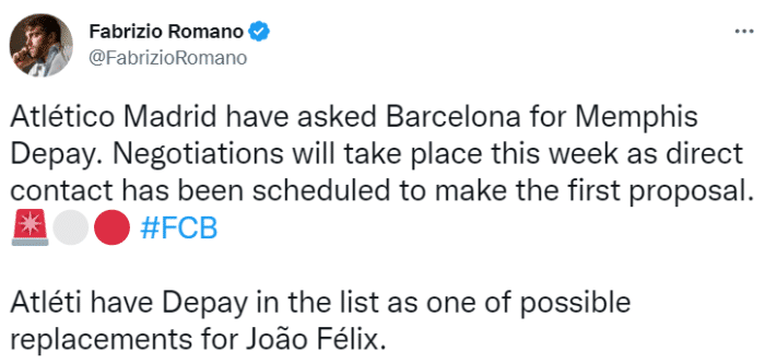 罗马诺表示,马竞已经向巴萨求购德佩,马竞将在本周与巴萨进行会谈以提出他们的首份报价,双方将就此展开谈判。