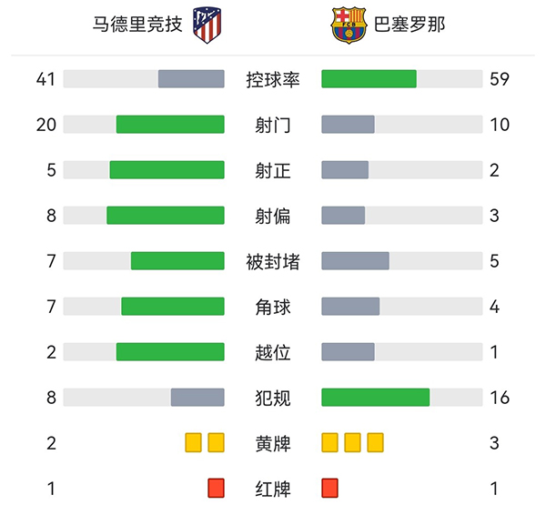 全场比赛结束,最终巴萨1-0马竞,3分优势领跑积分榜。