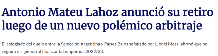 根据此前的报道,原本拉奥斯被定为执法世界杯决赛的裁判,但因其在阿根廷vs荷兰的1/4决赛中表现糟糕,最终波兰裁判马齐尼亚克成为了决赛的执法裁判。