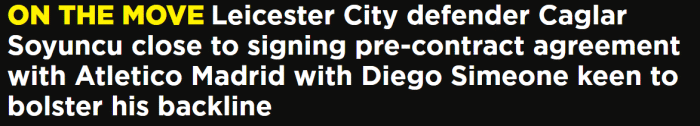 直播车01月04日讯 据英国媒体talksport报道,马竞将今夏免签莱斯特城的土耳其中卫瑟云聚。