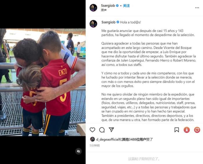 来源:直播车12-16 21:20直播车12月16日讯 西班牙34岁老将布斯克茨通过社交媒体宣布,他将退出西班牙国家队。