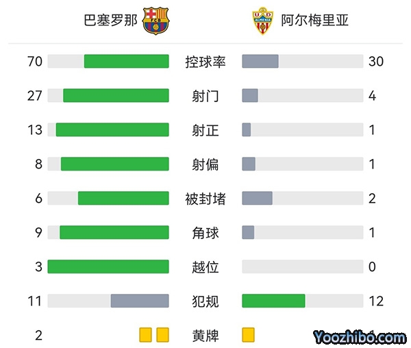 全场比赛结束,巴萨2-0阿尔梅里亚。