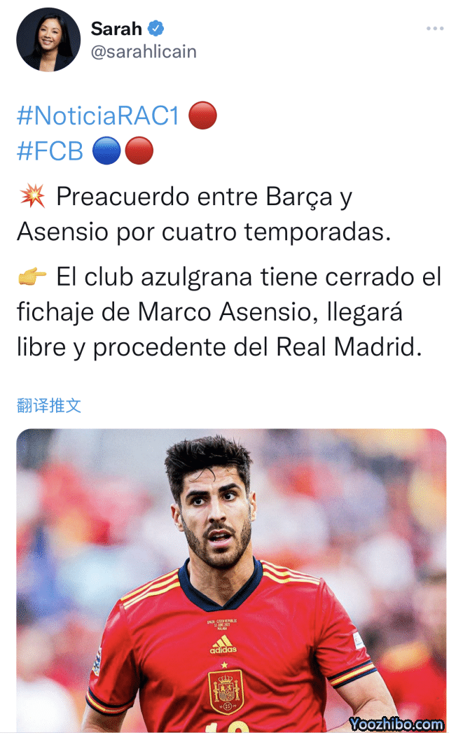 来源:直播车09-26 18:31直播车09月26日晚,西班牙知名媒体RCA1记者Sarah Li Cain扔出了一则重量级消息,效力于皇马的26岁“王储”阿森西奥已经与巴萨完成了签约。双方签下了一份为期4个赛季的预先协议。由于与皇马的合同只剩1年,阿森西奥将在明夏以自由球员的身份加盟死敌。