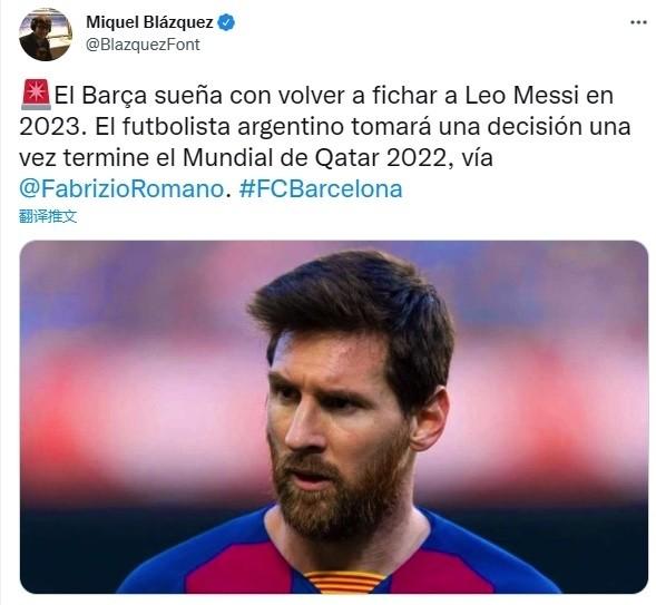 来源:直播车09-23 12:16直播车09月23日,来自知名记者Miquel Blazquez的透露,西甲豪门巴塞罗那希望能在2023年的夏天重新签回梅西,而梅西本人将会在世界杯结束后,再决定自己的未来。