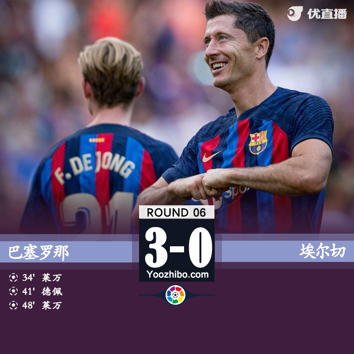第34分钟,巴尔德左路下底接到队友分球,随后送出传中,莱万中路跟进包抄破门,巴萨1-0埃尔切。