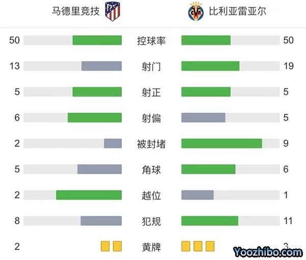 全场比赛结束,马竞0-2比利亚雷亚尔。