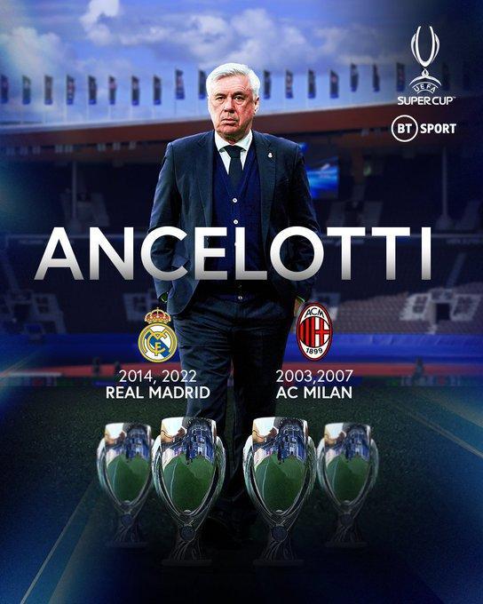 安切洛蒂此前曾在2003年和2007年带领米兰夺得欧超杯,并在2014年带领皇马赢得这样荣誉,现在,安帅已经4次夺得欧超杯,排名历史第一,超过瓜迪奥拉(3次)、西蒙尼(2次)、齐达内(2次)、范加尔(2次)、弗格森(2次)、萨基(2次)和雷蒙-高达斯(2次)。
