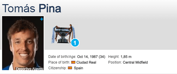 皮纳今年34岁,来自西班牙,身高1.85米,司职中场,今夏和阿拉维斯的合同到期后,自由加盟嵩山龙门。