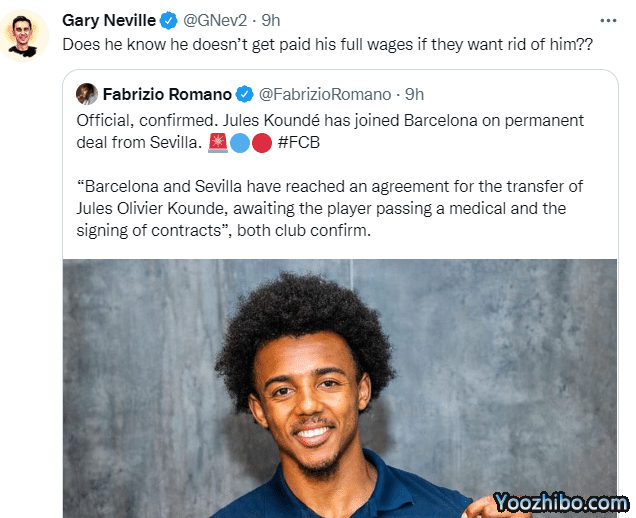 直播车07月29日讯今天巴萨官宣签下塞维利亚中卫孔德,随后曼联名宿加里-内维尔在推特上发文嘲讽巴萨。