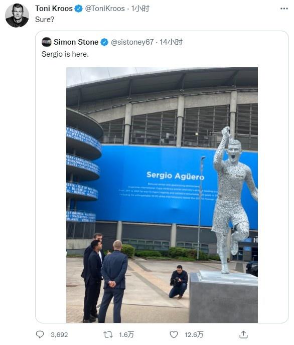 直播车05月14日讯 消息,有网友称曼城的阿圭罗雕像神似皇马球星克罗斯,克罗斯在推特上做了回应。