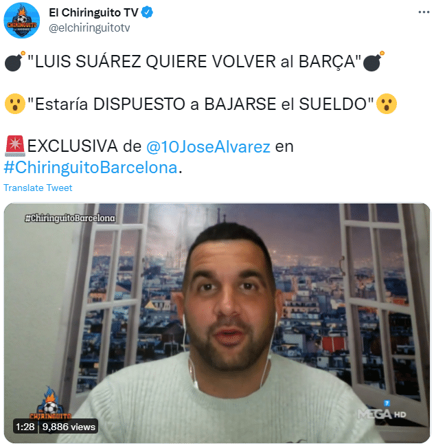 直播车05月06日讯 据西班牙六台节目ElChiringuito记者JoseAlvarez报道,苏亚雷斯想重回巴萨,并愿意降薪加盟。