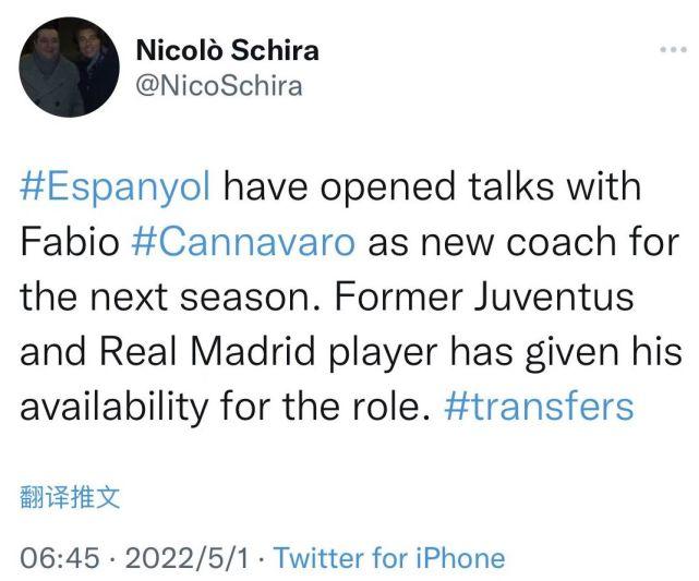 迪马济奥透露,西班牙人队下赛季将迎来巨变。球队现任主帅莫雷诺,下赛季将不会继续执教。中国老板陈雁升,考虑将体育经理鲁菲特一起换掉。至于新帅人选方面,陈雁升希望前恒大主帅卡纳瓦罗能接掌西班牙人。当后者在中国执教时,陈雁升就对其非常欣赏。据悉,陈雁升已经联系了卡纳瓦罗,并且开启了谈判。更有消息称,双方已经达成协议。