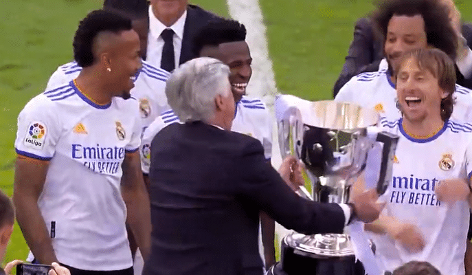 安切洛蒂依旧是最低调的一个,他举起奖杯,欢庆一会之后就递给了莫德里奇,魔笛也非常开心,接过奖杯与队友一起庆祝。