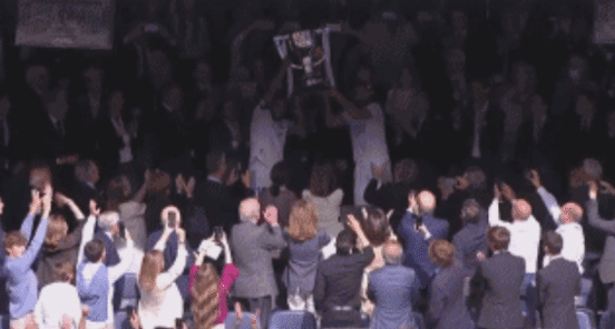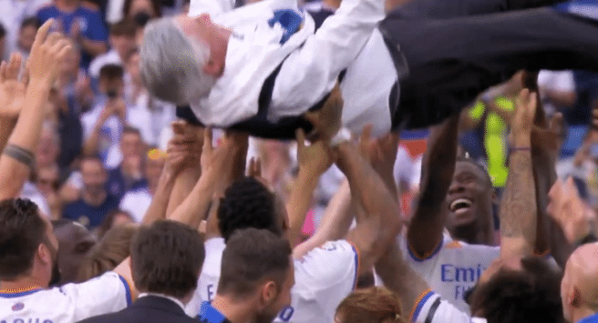 很快安切洛蒂就被皇马的球员们给抛起来了,值得一提的是在被抛起来之前,安切洛蒂一直都在研究如何穿冠军T恤,还没有穿上,就被皇马的球员们抛起来了。