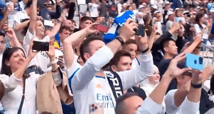 皇马的球迷们目睹球队夺冠,也在现场记录下这一幕,同时纷纷送上掌声。