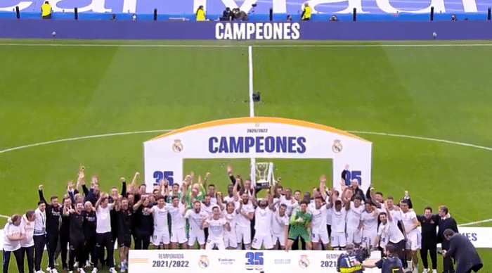 全队高举冠军奖杯,兴奋庆祝,第一个举起冠军奖杯的是马塞洛,这也是赛前媒体的报道是一样的,作为球队功勋,马塞洛举起联赛冠军奖杯。