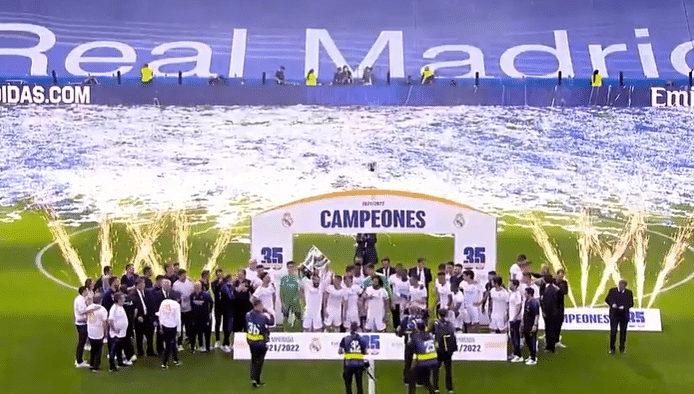 现场已经搭建起了冠军台,本泽马和马塞洛从看台上领取了本赛季西甲联赛冠军奖杯,他们两人高举冠军奖杯。