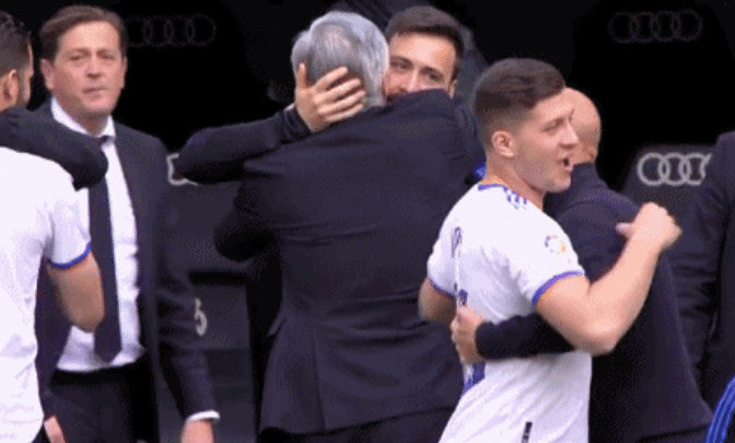 莫德里奇和马塞洛拥抱,两大老将非常不容易,他们率领皇马夺冠。莫德里奇夺得个人皇马生涯第19冠,马塞洛创纪录,他以24冠的成绩,超越皇马传奇亨托,成为俱乐部历史上随队夺得冠军数最多的球员。