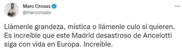 直播车04月27日讯 消息,前巴塞罗那球员马克-克罗萨斯发推称,这支灾难性的皇马在欧冠还活着令人惊讶。