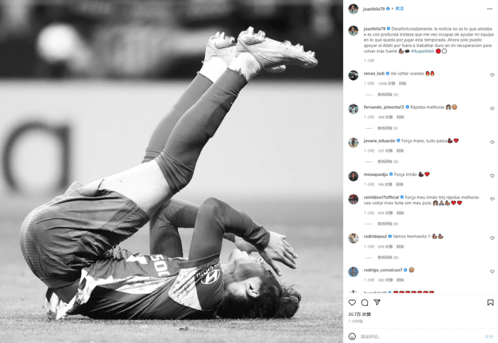 菲利克斯在上周末的西甲联赛中左大腿腿筋受伤,今天凌晨,这名葡萄牙球星证实自己已经赛季报销。