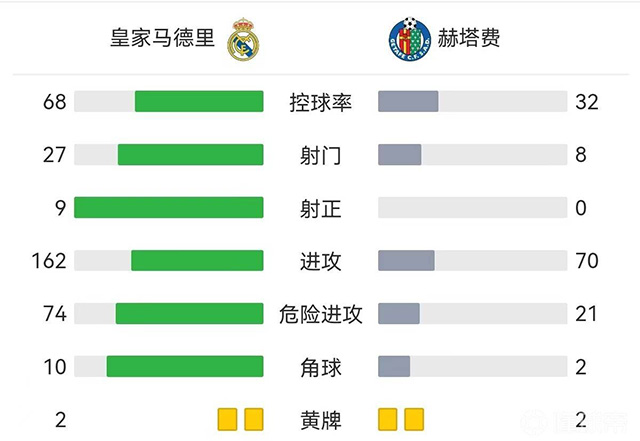 全场比赛结束,皇家马德里主场2-0轻取赫塔费。