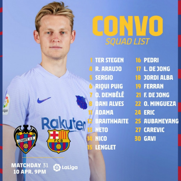 4月9日直播车讯 北京时间4月11日凌晨,巴萨将在西甲第31轮比赛中客场对阵莱万特,巴萨公布了本场比赛的球员名单,德佩、皮克因伤缺席。