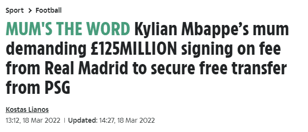 直播车03月19日讯 西班牙媒体消息,姆巴佩的母亲希望儿子自由加盟皇马时获得1.25亿英镑签字费。
