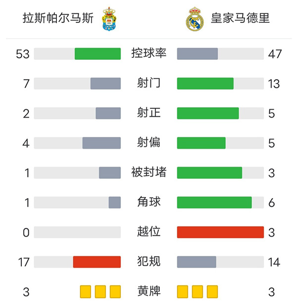 第53分钟,桑德罗-拉米雷斯右路面对吕迪格防守,突入禁区送出横传,哈维-穆尼奥斯无人盯防抢点攻门得手,拉斯帕尔马斯1-0皇马。
