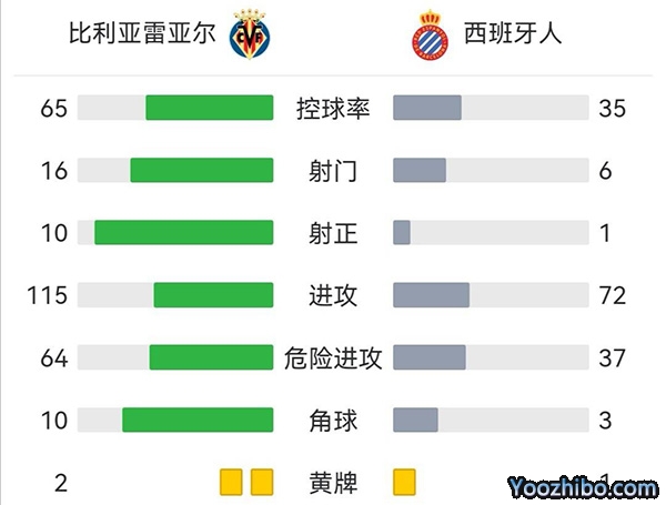 全场比赛结束,比利亚雷亚尔5-1西班牙人。