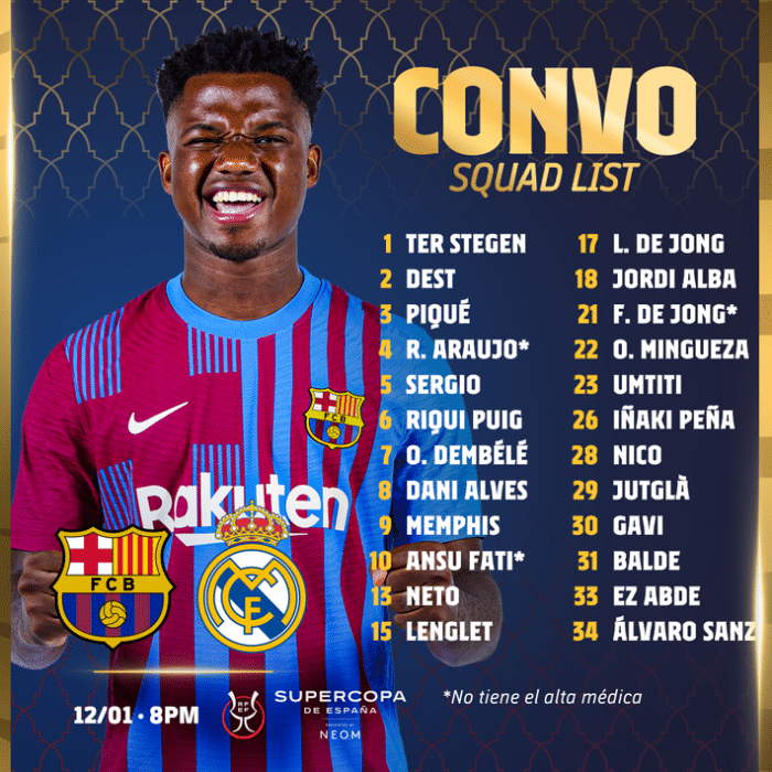 来源:直播车01-10 22:32直播车01月10日讯 ,巴塞罗那公布了和皇马西班牙超级杯比赛的大名单,佩德里和费兰-托雷斯因为新冠阳性继续缺席。